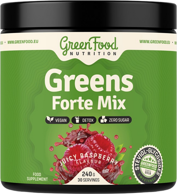 GreenFood Nutrition Greens Forte Mix, juicy raspberry 240 gVše o produktuDoplňující informaceHodnocení produktuMladý ječmen, tato zelená potravina je bohatá na různé vitamíny, minerální látky, antioxidanty a další bioaktivní látky. Mladý ječmen v doplňcích stravy nabízí synergický účinek díky unikátním nutričním profilům každé ze svých složek. Mladý ječmen je mladá rostlina ječmene setého, kterou používaly již naše prababičky. Z rostliny je sklizen jen zelený výhonek. Taková rostlina ječmene setého totiž obsahuje nejvyšší množství biologicky aktivních látek. Ječmen obsahuje chlorofyl, železo, kyselina listovou a vitamín C. Mladý ječmen obsahuje 4x více vápníku, než je v mléce, 22x více železa než ve špenátu. Obsahuje také esenciální aminokyseliny, více než 12 minerálních látek a 13 různých vitamínů (včetně vitamínu K). Právě zásluhou tohoto složení se mladý ječmen v posledních letech stal velmi vyhledávaným u spotřebitelů orientovaných na aktivní životní styl.