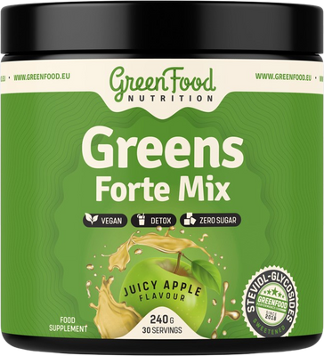 GreenFood Nutrition Greens Forte Mix, juicy apple 240 gVše o produktuDoplňující informaceHodnocení produktuMladý ječmen, tato zelená potravina je bohatá na různé vitamíny, minerální látky, antioxidanty a další bioaktivní látky. Mladý ječmen v doplňcích stravy nabízí synergický účinek díky unikátním nutričním profilům každé ze svých složek. Mladý ječmen je mladá rostlina ječmene setého, kterou používaly již naše prababičky. Z rostliny je sklizen jen zelený výhonek. Taková rostlina ječmene setého totiž obsahuje nejvyšší množství biologicky aktivních látek. Ječmen obsahuje chlorofyl, železo, kyselina listovou a vitamín C. Mladý ječmen obsahuje 4x více vápníku, než je v mléce, 22x více železa než ve špenátu. Obsahuje také esenciální aminokyseliny, více než 12 minerálních látek a 13 různých vitamínů (včetně vitamínu K). Právě zásluhou tohoto složení se mladý ječmen v posledních letech stal velmi vyhledávaným u spotřebitelů orientovaných na aktivní životní styl.