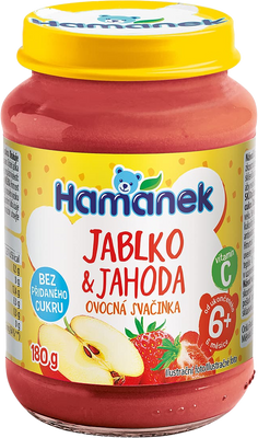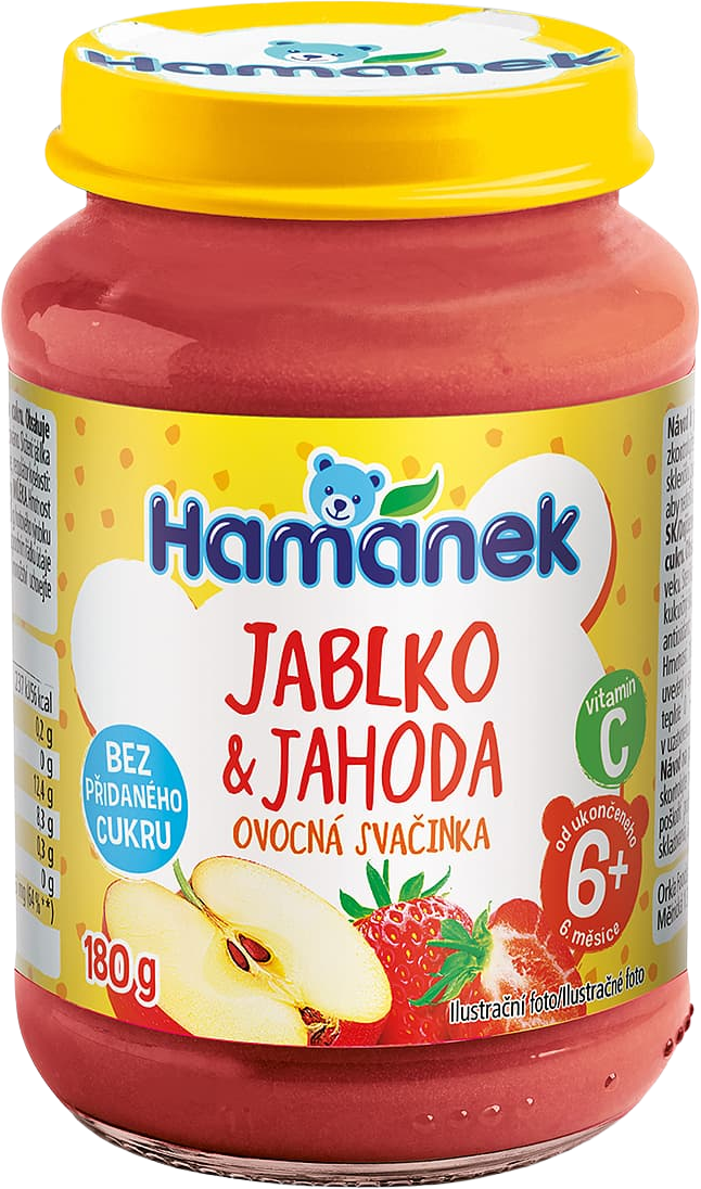 - Ovocný příkrm Hamánek Jahoda a jablko bez přidaného cukru je ovocná svačinka vhodná už od ukončeného 6. měsíce