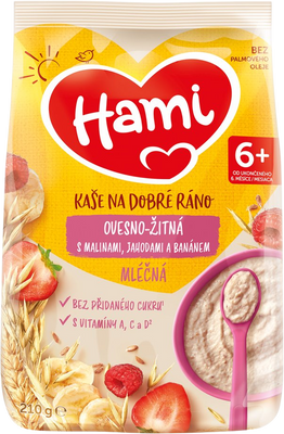 Hami kaše Na dobré ráno je vyrobena z pečlivě kontrolovaných obilovin, které jsou přirozeným zdrojem energie. Také obsahuje potřebné vitamíny a minerální látky. Mimo jiné obsahuje vitamín D a vápník dle požadavků legislativy potřebné pro normální růst a vývin kostí u dětí. Více informací