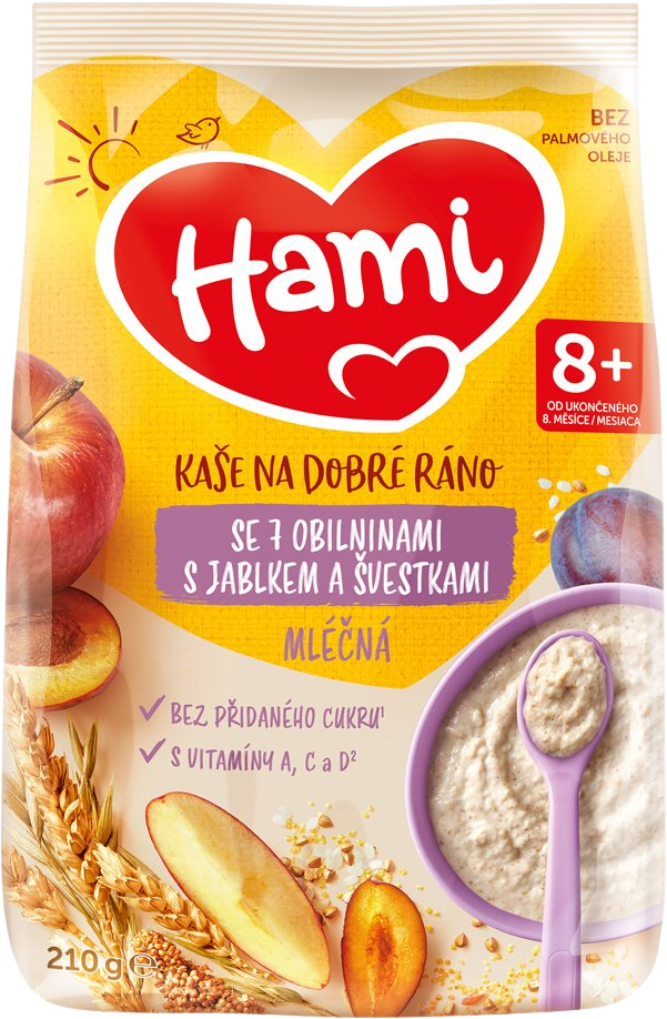 Hami mléčná kaše se 7 obilninami s jablkem a švestkami je vhodná pro kojence a malé děti od ukončeného 8. měsíce. Díky pestrému výběru obilovin a ovoce je přirozeným zdrojem energie a doprovází děťátko během jeho přirozeného vývoje. Více informací