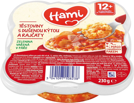 Hami masozeleninový talířek Těstoviny s dušenou kýtou a rajčaty, 12+ 230 gVše o produktuDoplňující informaceHodnocení produktuVaše děťátko oslavilo první narozeniny a stává se zvídavým batoletem. Snaží se dělat to, co vy, a nejraději by jedlo s vámi rovnou z vašeho talíře. Mějte ale na paměti, že jeho výživové nároky jsou stále jiné než ty vaše. Batolata by měla mít dostatečný příjem zeleniny a pestrou stravu s nižším podílem soli, sacharidů a bílkovin než jaká je doporučována dospělým. S vymýšlením jídelníčku ani každodenním vařením si již nemusíte dělat starosti. Stačí vyzkoušet masozeleninové příkrmy Hami Malý gurmán v praktickém talířku, které jsou určené právě pro děti od ukončeného 12. měsíce.