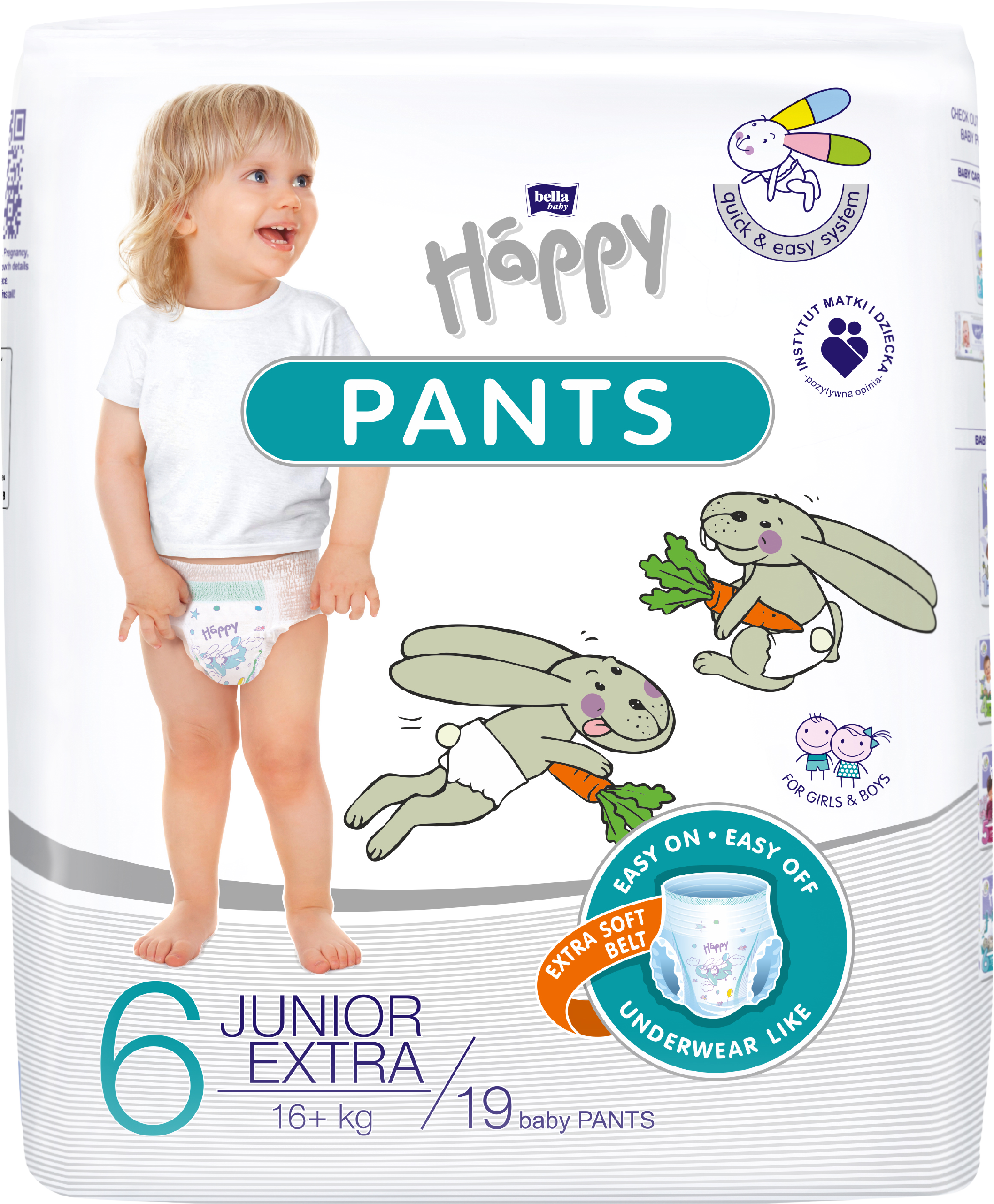 V každém balení jsou kalhotky se 2 odlišnými motivy potisku veselých zvířátek. Plenkové kalhotky Happy Pants nejsou parfemovány, neobsahují chlór ani latex a jsou dermatologicky testovány.