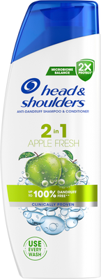 Head & Shoulders Apple Fresh 2v1, Šampon proti lupům 330 mlVše o produktuDoplňující informaceHodnocení produktuHead & Shoulders 2in1 Apple Fresh šampon proti lupům pro všechny typy vlasů a všechny typy pokožky hlavy. Působí i proti odolným lupům. Šampon pro každodenní použití pro muže i ženy se složením Microbiome Balance, které se zaměřuje na hlavní příčinu lupů a udržuje vyvážený mikrobiom pokožky hlavy. Působí proti viditelným i neviditelným lupům tím, že uvolňuje 2x více ochranných složek, které se dostávají do pórů a brání návratu odolných lupů. Tento šampon 2v1 obsahuje o 25 % více ošetřujících složek než běžný šampon Head & Shoulders, je klinicky ověřený, dermatologicky testovaný a má vyvážené pH.