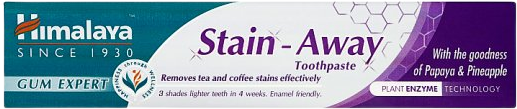 Himalaya Zubní pasta Stain – Away je bylinná zubní pasta založená na rostlinné enzymatické technologii, která jemně odstraňuje povrchové skvrny způsobené kávou nebo čajem. Obsahuje rostlinné enzymy z papáje a ananasu. Ty odstraňují skvrny ze zubů a zabraňují jejich opětovnému zabarvení.