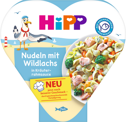 Hotové pokrmy od značky Hipp jsou v praktických plastových dózách, které jsou vhodné i na cesty. S dětskými hotovými pokrmy HiPP v praktických plastových srdíčkách nabízíte svým malým fajnšmekrům vyvážená a rozmanitá jídla. Vyzkoušejte tyto těstoviny s divokým lososem s bylinkovo-smetanovou omáčkou.