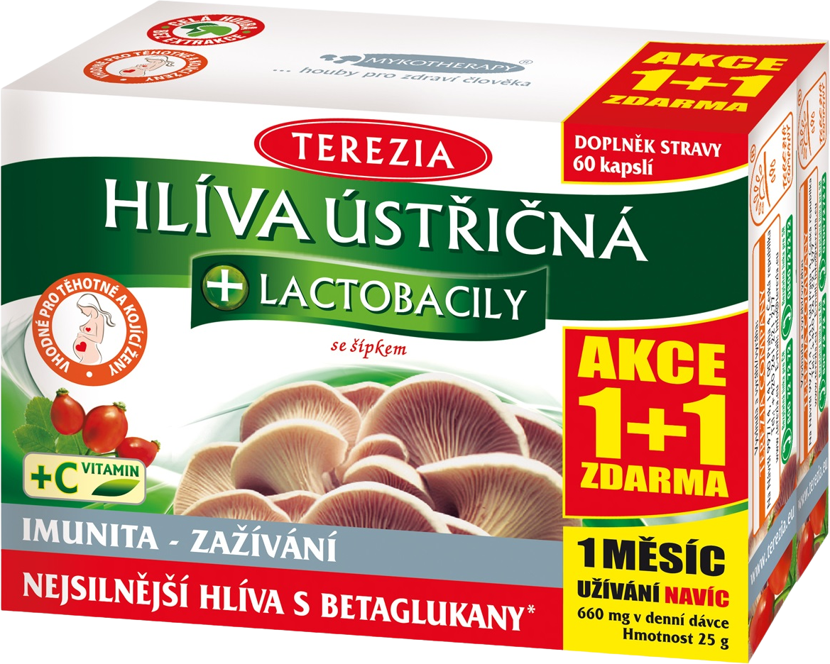 V Terezii vyvinuli doplněk stravy, který kombinuje hlívu ústřičnou, šípek a lactobacily. Hlavní složkou výrobku je samozřejmě hlíva, která pochází od léty prověřených certifikovaných dodavatelů a má deklarovaný obsah betaglukanů. Důležitou vlastností hlívy je rovněž to, že funguje jako prebiotikum pro probiotika. V denní dávce naleznete 10 mld. probiotik.