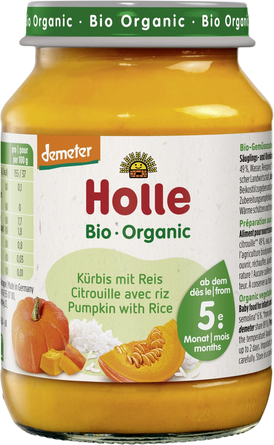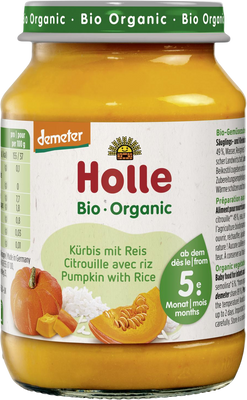 Holle = víc jenže jen bio. Tradiční prémiová švýcarská značka přináší vašim dětem od 5. měsíce chutnou přesnídávku - dýně s rýží- bez přidaného cukru, soli, konzervačních látek a aromat. Je označena značkou demeter, která je ekvivalentem nejvyšší kvality dětské výživy z biologického zemědělství na trhu a zároveň je synonymem pro udržitelné hospodářství - v souladu s přírodou. Produkt je CO2 neutrální. Více informací