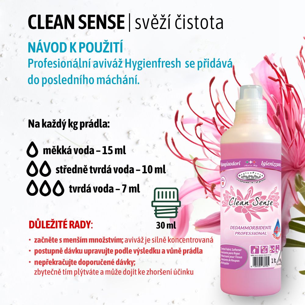 Dopřejte svému prádlu luxusní hebkost a jemnou květinovou vůni s profesionální koncentrovanou aviváží HygienFresh® Clean Sense. Vyvinuta s ohledem na efektivitu, šetrnost k tkaninám a dlouhotrvající svěžest.