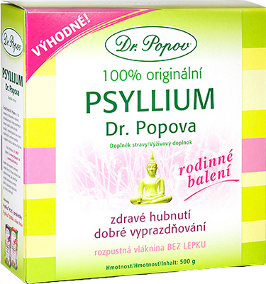 Psyllium Dr. Popova změkčuje stolici a zároveň zvětšuje její objem, čímž významně napomáhá správnému a snadnému vyprazdňování (důležité při zácpách, hemoroidech, v těhotenství, apod.). Psyllium Dr. Popova oceníte ale i z dalších důvodů: psyllium podporuje správný metabolismus tuků, pomůže vám také udržovat správnou hladinu cholesterolu a zvyšuje denní spotřebu vlákniny. Pokud se snažíte zhubnout, konzumujte Psyllium Dr. Popova nalačno – budete se rázem cítit nasycení