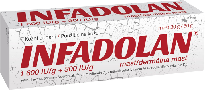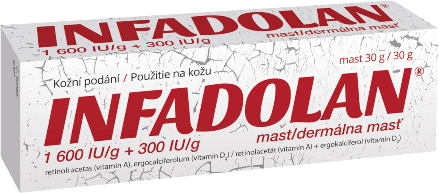 Infadolan se používá na neinfikované drobné rány, oděrky, popáleniny I. stupně, na suchou popraskanou kůži, na trhliny v kožních ryhách. Infadolan je mast pro zevní použití obsahující vitamin A a vitamin D2. Více informací