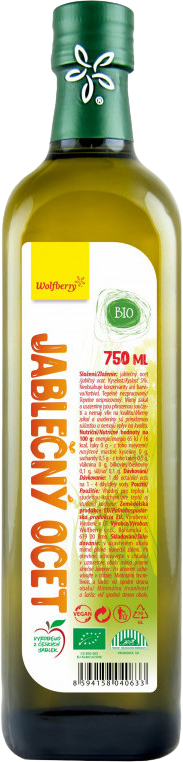 BIO Jablečný ocet*. Kyselost 5%. Neobsahuje konzervanty ani barviva.