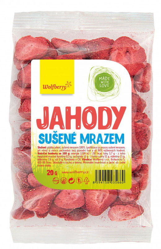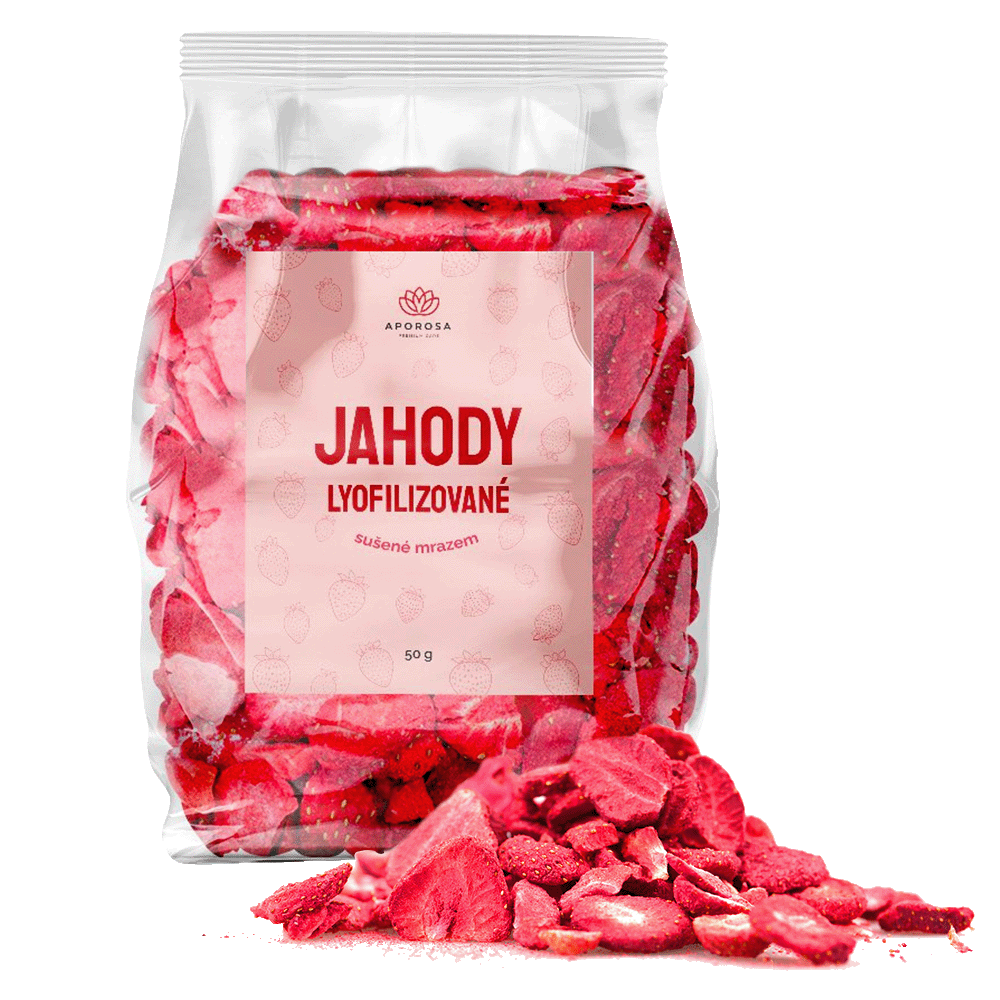 Sladké a červené lesní plody milují děti i dospělí. Sušené jahody mají množství pozitivních účinků na naše zdraví. Obsahují látku anthocyanin, která je silným antioxidantem a chrání nás před nemocemi. Jahody pozitivně působí na náš kardiovaskulární systém, zamezují tvorbě zánětů či rakoviny. Obsahují více vitamínu C než pomeranče nebo citrony. Jahody obsahují mangan, což je stopový prvek, který má pozitivní vliv na trávení, reguluje překyselení žaludku a jahody jsou díky tomu účinným pomocníkem proti zácpě nebo žlučovým, ledvinovým a močovým kamenům. Lyofilizované (mrazem sušené) jahody si navíc udržují maximum vitamínů a minerálů.