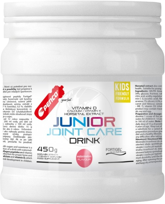 Penco® Junior Joint Care Drink je práškový koncentrát pro přípravu nápoje s funkční dávkou bioaktivních kolagenních peptidů Fortigel®. Je obohacen vápníkem a vitamíny C, D3 a K2 pro normální kosti a klouby. Vhodné pro mladé sportovce.