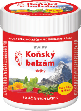SWISS Koňský balzám je unikátní krém poskytující rychlou a dlouhotrvající úlevu kloubům, unaveným svalům a namoženým zádům. Originální receptura obsahuje extrakty z 30 účinných látek včetně BOSWELLIE, OSTROPESTŘCE a CHMELE. Více informací