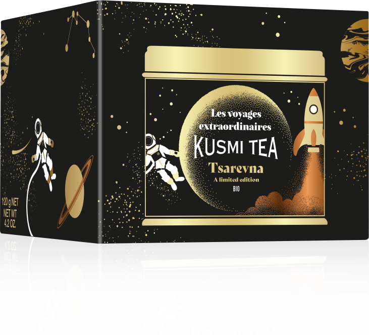 Limitovaný vánoční čaj Kusmi Tea Tsarevna. Organický černý čaj s podmanivým aroma pomerančů, koření, vanilky a mandlí v originálním tmavém designu inspirovaným motivy z fascinujícího světa podle Jula Verna. Více informací