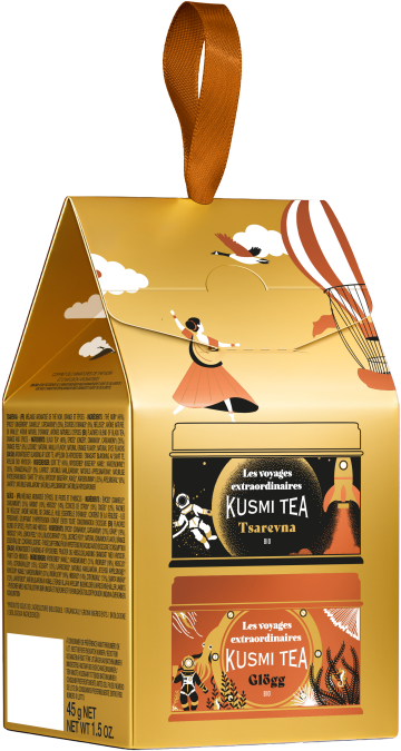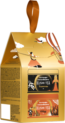 Uvnitř najdete dvě exkluzivní miniatury: Tsarevna (20 g), organický vánoční černý čaj s okouzlujícími tóny pomeranče, vanilky a koření; a Glögg (25 g), sváteční organický bylinný čaj příjemně okořeněný štiplavými nádechy ibišku, hroznů a černého rybízu.