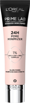 Pleť bez pórů s bází pod make-up Prime Lab 24H Pore Minimizer obsahující komplex AHA, BHA a LHA kyselin od L'Oréal Paris. Více informací