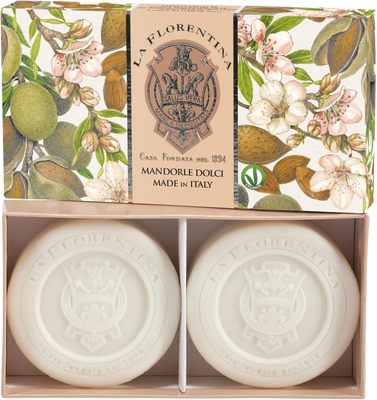 La Florentina Kazeta mýdel Mandorle Dolci 2 x 115 gVše o produktuDoplňující informaceHodnocení produktuExkluzivní, pečlivě vyrobené domácí mýdlo s mandlovým olejem. Speciální rostlinné složení obohacené o bio olivový olej, bio extrakty a bambucké máslo. Mýdla jsou zabalena v dárkové kartónové krabičce. Ve výrobku a jeho obalu nejsou použity žádné živočišné produkty.