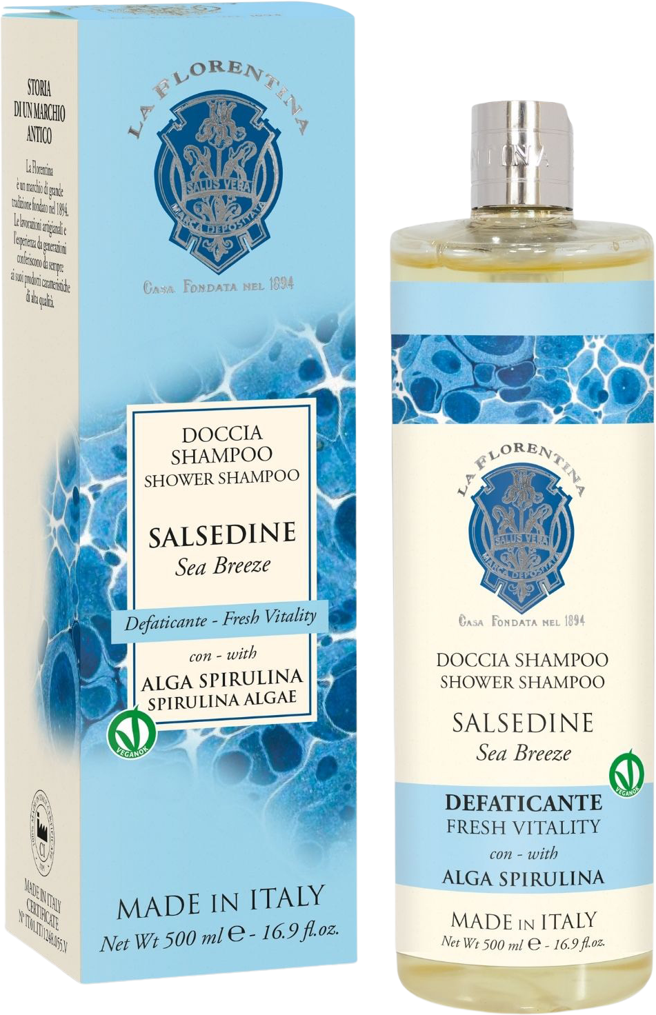 Šampón na vlasy a sprchový gel 2v1. Obsahuje přírodní výtažky z řasy Spirulina a olivový olej. Zabaleno v papírové dárkové krabičce. Více informací