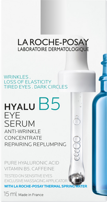 LA ROCHE-POSAY Hyalu B5 oční sérum je regenerační oční sérum s obsahem dvou typů kyseliny hyaluronové, vitaminu B5 a 10% komplexu (kofein, niacinamid, hepes), které vyplňují vrásky kolem očí a korigují tmavé kruhy pod očima.