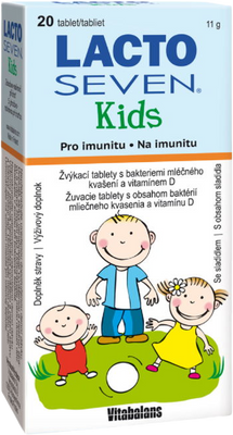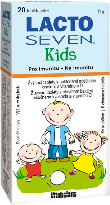 Cucací tablety s obsahem Xylitolu a bakterií mléčného kvašení. Bakterie mléčného kvašení jsou součástí běžné střevní mikrobiální flóry. Lacto Seven Kids obsahuje 7 různých přirozených kmenů bakterií mléčného kvašení (t.j. Lactobacillus a Bifidobacterium) a vitamín D3. Více informací