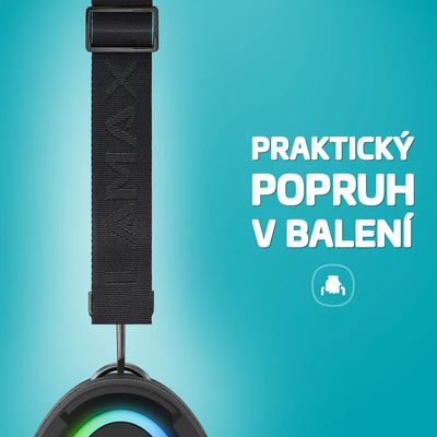 Minimalistický, ale moderní a vychytaný design repráku s LED podsvícením upoutá na první pohled a je škoda schovávat ho doma. Přidali jsme proto ergonomický popruh pro snadný přenášení, ať si svýho parťáka můžeš brát kamkoliv s sebou. Když zmoknete, nic se neděje, voděodolnost IPX6 má vodu pod kontrolou. A pokud by tě trápilo, že budeš muset studovat návod, tak klídek, tady je ovládání tak snadný a intuitivní, že ho zvládne i děcko.