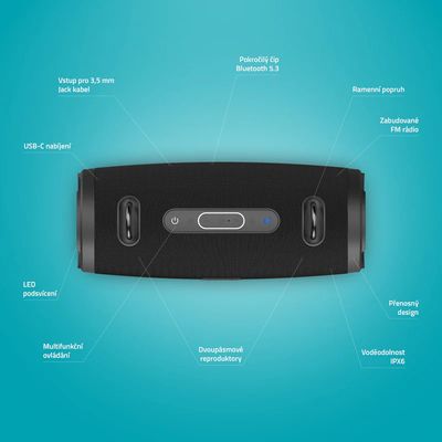 Je jedno, jestli máš playlist na party na jednom zařízením a oblíbený podcasty na jiným, přes nejmodernější Bluetooth 5.3 se reprák automaticky spáruje s jakýmkoliv zařízením a frčí až na vzdálenost 15 metrů. Trápit tě nemusí ani formáty, tahle mašinka podporuje MP3, WAV, FLAC a široká je i škála podporovaných připojení - Micro SD, USB-A, 3,5 mm AUX. Parádní záležitostí je taky možnost naladění FM rádia třeba pro případy, kdy si zapomeneš vlastní muziku. A jelikož každá událost si žádá správnou atmošku, máš na výběr z 5 nastavitelných LED efektů.