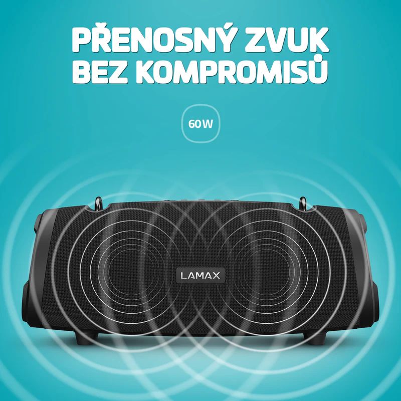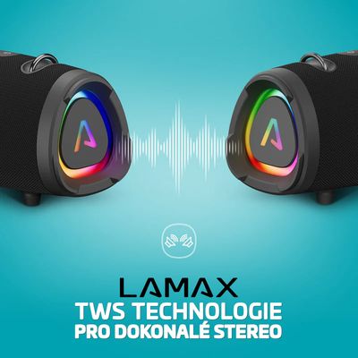 Přenosný reproduktor LAMAX Eclipse1, výkon 60 W, dvoupásmové reproduktory, baterie až 9,5 hodiny, Bluetooth 5.3, automatické párování, až 5 nastavitelných LED efektů, FM rádio, podpora různých formátů a připojení, IPX6, USB-C, popruh přes rameno. Více informací