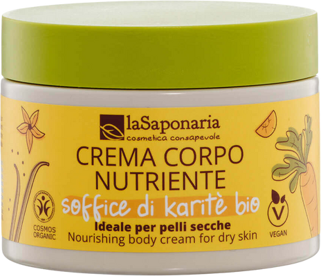 laSaponaria Výživný tělový krém s BIO bambuckým máslem 200 mlVše o produktuDoplňující informaceHodnocení produktuVýživný tělový krém laSaponaria s hedvábnou texturou a příjemnou vůní vanilky je skvělým každodenním pomocníkem zejména pro suchou pokožku. Díky směsi kvalitních organických surovin, jako jsou bambucké a kakaové máslo či kokosový a slunečnicový olej, účinně poskytuje hlubokou výživu a zanechává pokožku pevnou, jemnou a nádherně zářivou. Tento přírodní krém je certifikovaný BDIH Cosmos Organic a ocení jej také vegani, jelikož neobsahuje žádné živočišné složky.