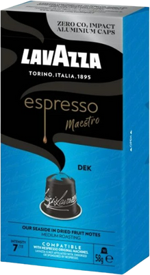 Lavazza Kapsle pro Nespresso, espresso Maestro DEK (bez kofeinu) 10 ksVše o produktuDoplňující informaceHodnocení produktuLavazza Espresso Decaffeinato nabízí perfektně vyvážené espresso bez kofeinu s jemnými tóny sušeného ovoce a lehkou čokoládovou dochutí, které potěší všechny milovníky kávy i bez obsahu kofeinu.