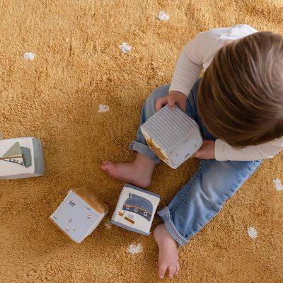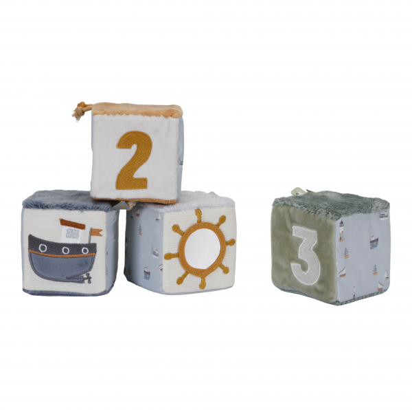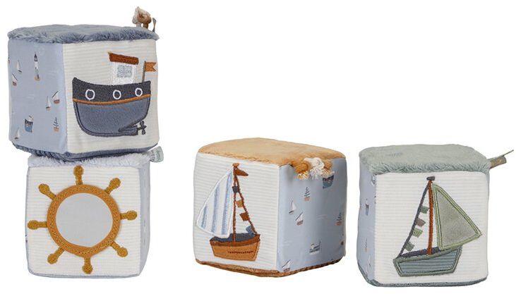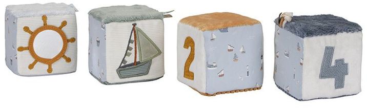 - Sada čtyř měkkých plyšových kostek z kolekce Little Dutch Námořnický záliv obsahuje krásné motivy ze života na rmoři a nabízí mnoho aktivit, které lákají ke zkoumání a stimulují smysly dětí