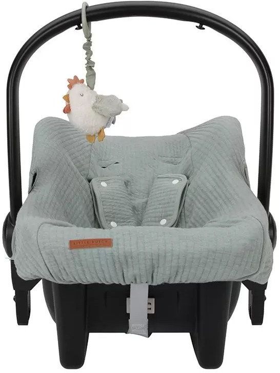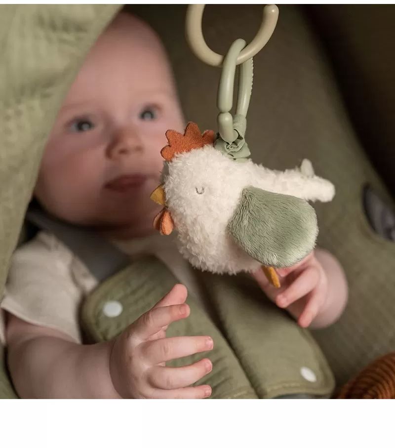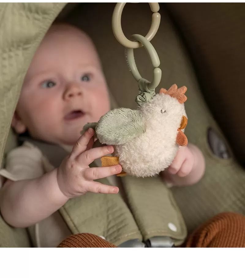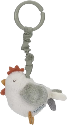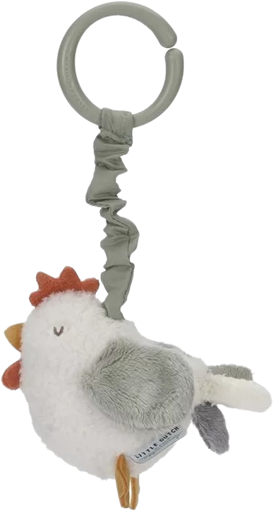 Plyšová slepička po zatažení za šňůrku vibruje a legračně poskakuje. Hračku je možné snadno zavěsit na autosedačku, kočárek či hrazdu na hrací dece. Hračka je součástí designové kolekce hraček Little Dutch Farma.