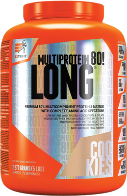 Extrifit Long 80 Multiprotein Cookies cream 2270 gVše o produktuDoplňující informaceHodnocení produktuLong® 80 Multiprotein je multikomponentní (vícesložkový) protein obsahující bílkoviny z 8 proteinových zdrojů. Díky tomu je výrobek typický vyváženým aminokyselinovým spektrem, což je pro jeho účinek velmi důležité! 75 % obsahu bílkovin produktu tvoří syrovátkové proteinové koncentráty, hydrolyzáty a izoláty a zdrojem dalších 25 % bílkovin je micelární kasein a vaječné bílkoviny.