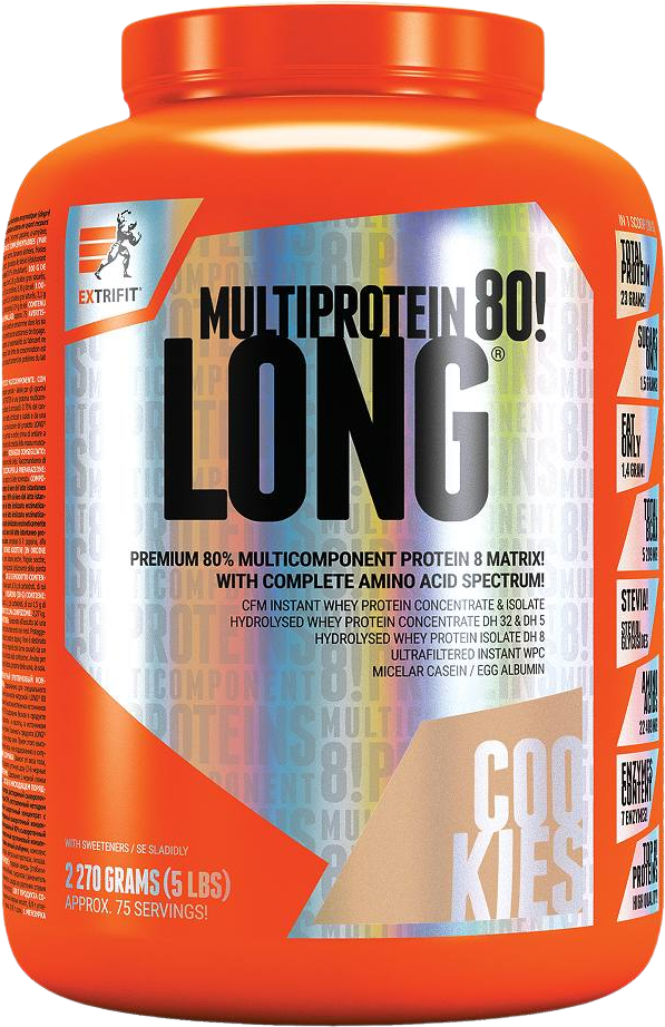 Extrifit® Vám přináší inovaci jednoho ze svých nejlepších a na trhu nejúspěšnějších produktů - Long 80 - 7 Hours se nyní jmenuje Long® 80 Multiprotein. Čím je Long® 80 Multiprotein lepší? Vylepšili jsme jeho složení: zastoupení jednotlivých bílkovinných zdrojů (zásadní je obsah enzymaticky hydrolyzovaného syrovátkového proteinu s nejvyšším stupněm hydrolýzy DH 32 a s vysokým obsahem krátkých peptidů), namísto dvou enzymů obsahuje komplex sedmi účinných enzymů a v neposlední řadě jsme také zvolili jako sladidlo steviolglykosidy, neboli sladidlo z rostliny stévie, které je přírodního původu. Navíc jsme vylepšili také chuť tohoto výrobku a nabízíme Vám novou lahodnou příchuť cookies, takže nový Long® 80 Multiprotein máte nyní v šesti příchutích! Více informací