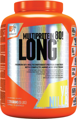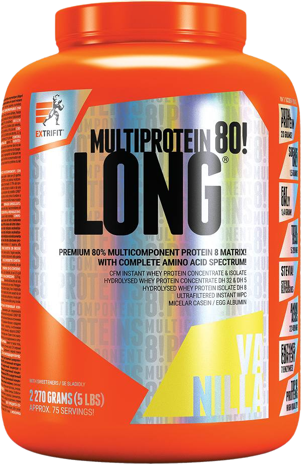 Extrifit® Vám přináší inovaci jednoho ze svých nejlepších a na trhu nejúspěšnějších produktů - Long 80 - 7 Hours se nyní jmenuje Long® 80 Multiprotein. Čím je Long® 80 Multiprotein lepší? Vylepšili jsme jeho složení: zastoupení jednotlivých bílkovinných zdrojů (zásadní je obsah enzymaticky hydrolyzovaného syrovátkového proteinu s nejvyšším stupněm hydrolýzy DH 32 a s vysokým obsahem krátkých peptidů), namísto dvou enzymů obsahuje komplex sedmi účinných enzymů a v neposlední řadě jsme také zvolili jako sladidlo steviolglykosidy, neboli sladidlo z rostliny stévie, které je přírodního původu. Navíc jsme vylepšili také chuť tohoto výrobku a nabízíme Vám novou lahodnou příchuť cookies, takže nový Long® 80 Multiprotein máte nyní v šesti příchutích! Více informací