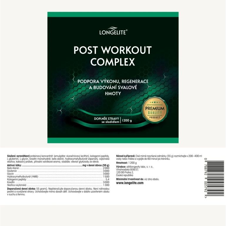 Longelite Post-Workout Complex je doplněk stravy určený pro sportovce a aktivní jedince, kteří chtějí po fyzické zátěži doplnit bílkoviny a živiny. Obsahuje syrovátkový protein, aminokyseliny a další účinné složky vybrané s ohledem na kvalitu, čistotu a dobrou střevní toleranci. Více informací