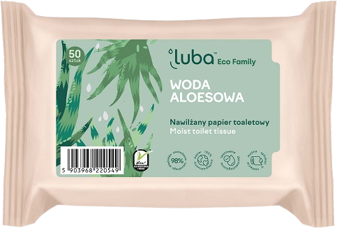 Vlhčený toaletní papír Luba Eco Family pro celou rodinu představuje dokonalý způsob, jak udržet vše čisté a svěží po každém použití toalety. Jedinečné složení s osvěžující vodou z aloe poskytuje příjemný pocit čištění a péče. Fyziologické pH, dermatologicky testováno. Materiál papíru 100% přírodního původu, splachovatelný do toalety. Používejte podle návodu.