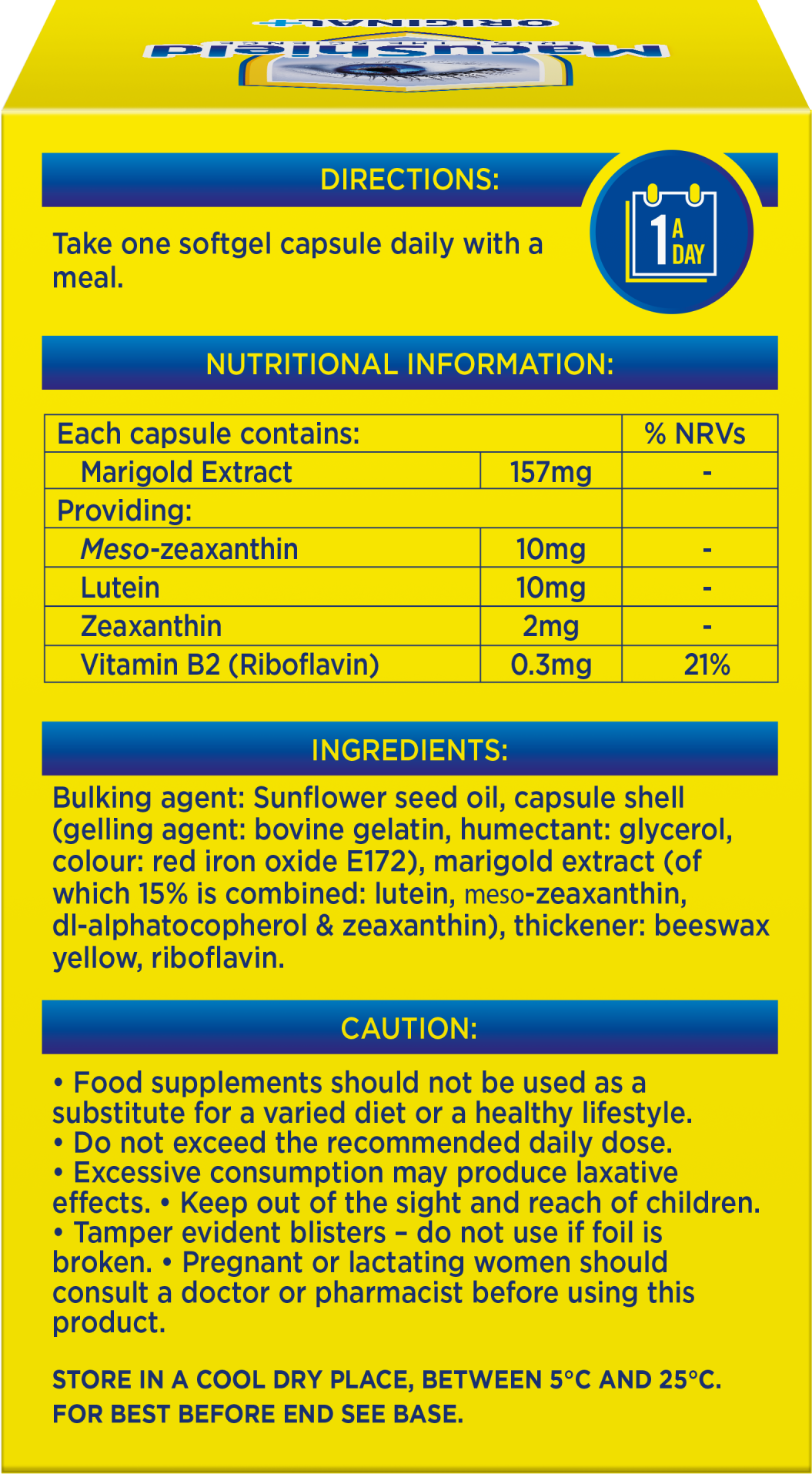 Doplněk stravy na podporu a ochranu zdraví očí. Má jedinečné patentované složení, které kombinuje všechny tři makulární karotenoidy v kapsli, kterou lze užívat jednou denně. Více informací