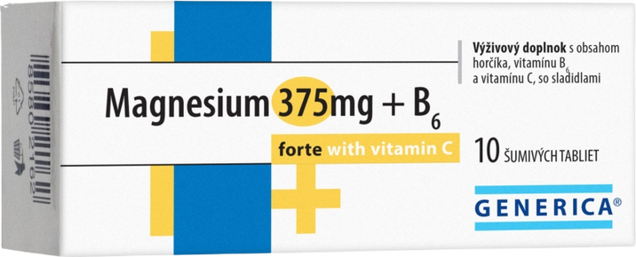 Generica MAGNESIUM 375 mg + B6 forte s vitamínom C 10 šumivých tabletVše o produktuDoplňující informaceHodnocení produktuPřispívá ke správnému fungování nervového systému a správné funkci psychiky, ke snížení vyčerpání a únavy a ke správné látkové výměně důležité pro tvorbu energie. Zároveň jako zdroj hořčíku přispívá ke správné funkci svalů a k udržení zdravých kostí a zubů. Vitamin B6 a vitamin C jsou prospěšné pro správnou funkci imunitního systému.