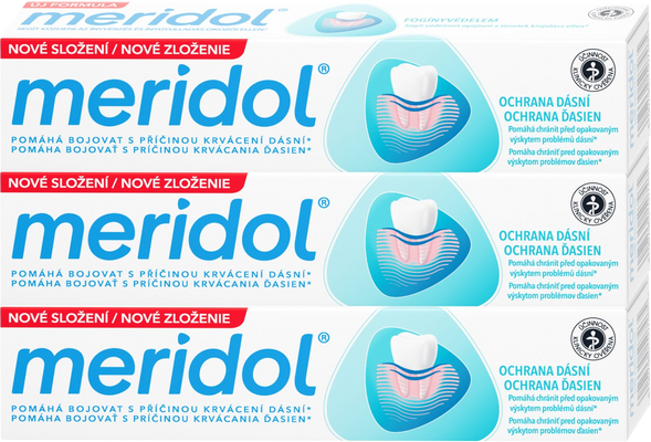 Zubní pasta Meridol® pomáhá bojovat s hlavní příčinou problémů dásní - bakteriemi v linii dásní. Dvojitý systém fluoridů pomáhá poskytovat okamžitou a dlouhotrvající ochranu před bakteriemi. Složení zubní pasty účinkuje efektivně a působí jemně jako balzám. Více informací