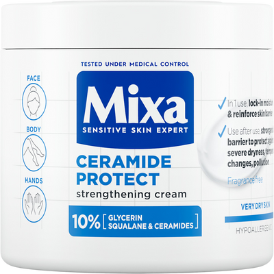 Mixa posilující tělová péče pro velmi suchou pokožku, 400 mlVše o produktuDoplňující informaceHodnocení produktuMixa posilující tělová péče pro velmi suchou pokožku s jemným složením obohaceným o ceramidy, skvalan a glycerin je vhodná pro citlivou pokožku. Nemastná textura, která se rychle vstřebává hydratuje a posiluje ochrannou bariéru pokožky.