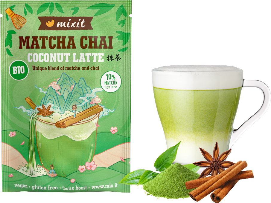 Sypká směs na přípravu rostlinného nápoje s matchou a chai kořením. Více informací