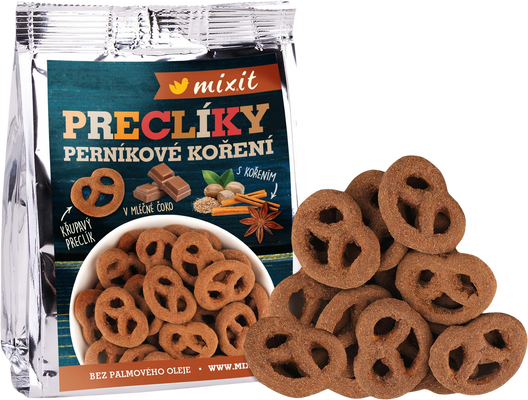 Mixit Preclíky s vánočním kořením jsou dokonalou kombinací sladkého, slaného a voňavého – ideální pro chvíle pohody, sdílení i jako drobný dárek. Křupavé preclíky jsou obalené v jemné čokoládě a dochucené směsí tradičního vánočního koření, které připomíná vůni perníčků, skořice a hřebíčku. Každé sousto nabízí vyvážený kontrast mezi slaností preclíku a sladkostí čokoládového obalu, doplněný o aromatické tóny, které evokují sváteční pečení.