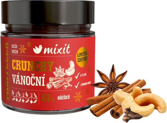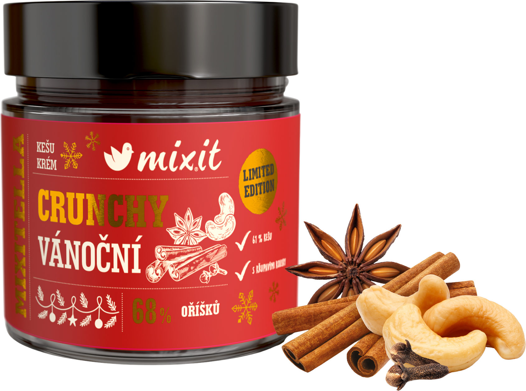 Mixitella Premium vánoční je limitovaná edice ořechového krému, která promění každé sousto v kouzelný sváteční okamžik. Spojení jemně mletých kešu, lískových oříšků a mandlí tvoří sametově hladký základ, který je přirozeně doslazen kokosovým cukrem a dochucen voňavou pravou vanilkou.