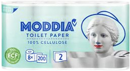 Moddia bílý toaletní papír dvouvrstvý bez parfemace. Balení obsahuje 8 rolí s celkovým návinem 200 m. Více informací