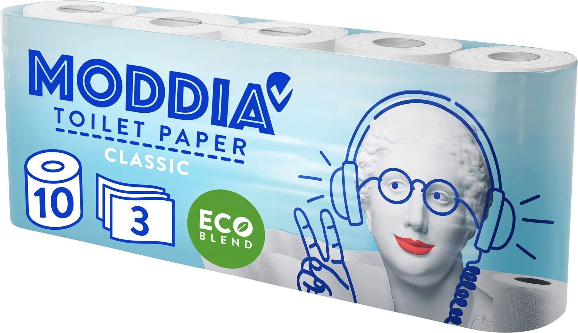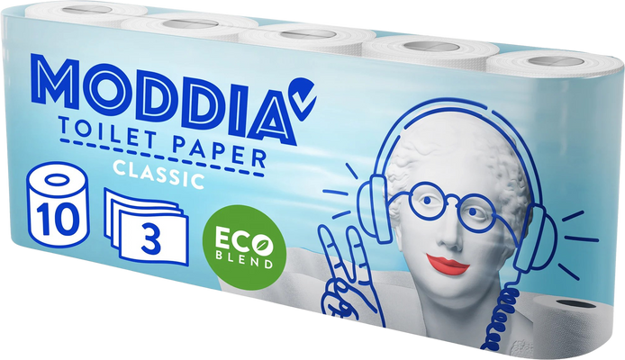 Moddia bílý toaletní papír třívrstvý bez parfemace. Balení obsahuje 10 rolí s celkovým návinem 286 m. Více informací