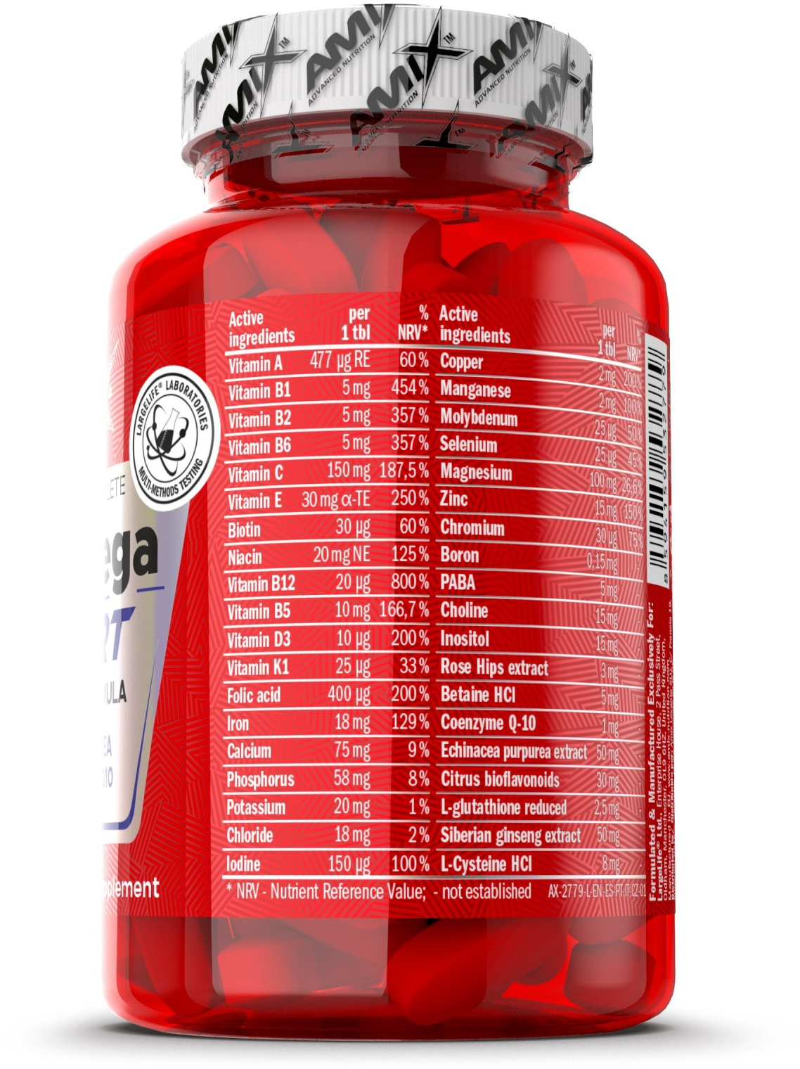 Složení v jedné tabletě: vitamín A 950 mg, vitamín C 150 mg, vitamín B1 5 mg, vitamín B2 5 mg, vitamín B3 20 mg, vitamín B6 5 mg, vitamín D3 10 mcg, vitamín E 30 mg, biotin 30 mg, kyselina listová 400 mcg, niacin 20 mcg, vitamín B12 20 mcg, vitamín B5 10 mg, vápník 75 mg, fosfor 58 mg, zinek 15 mg, hořčík 100 mg, draslík 20 mcg, mangan 2 mg, vitamín K1 25 mcg, měď 2 mg, jód 150 mcg, selen 25 mcg, molybden 25 mcg, chrom 30 mcg, bór 0,15 mg, železo 18 mg, křemík 10 mcg, inositol 15 mg, PABA 5 mg, cholin 15 mg, šípek (Rose Hips) 3 mg, betain HCl 5 mg, koenzym Q10 1 mg, echynacea purpurea 50 mg, citrusové bioflavonoidy 20 mg, L-glutation 2,5 mg, eleutherococcus senticocus 50 mg, L-cystein HCl 8 mg,
