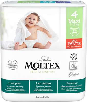 Moltex Pure & Nature Natahovací plenkové kalhotky Maxi 7–12 kg 22 ksVše o produktuDoplňující informaceHodnocení produktuDermatologicky testované, šetrné k pokožce. Balení plenek je vyrobeno z plastu z cukrové třtiny namísto ropných plastů. Plenky jsou nově vyráběny v Belgii při zachování německé kvality.