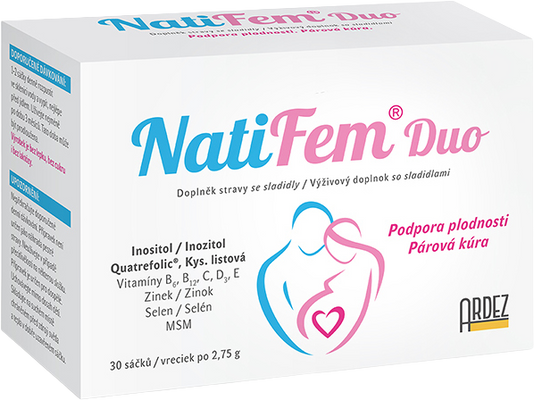 NatiFem Duo je doplněk obsahující kombinaci inositolů (myo-inositol a d-chiro-inositol) a folát 4. generace Quatrefolic®, kyselinu listovou, vitamíny E, D3, C, B6 a B12, selen, zinek a MSM.